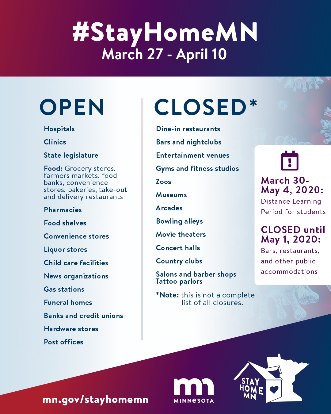 Governor Walz recent Executive Order 20-20 directing members to stay at home states public parks may remain open: